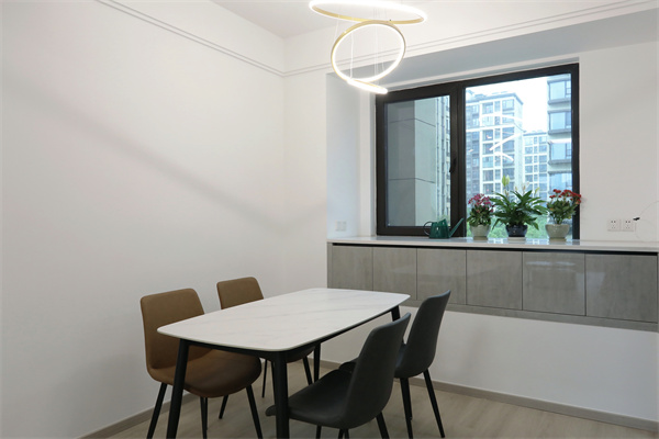 客餐廳一體的設計,保留了足夠的活動范圍,地面通鋪地板,創造不急不躁的空間氛圍。