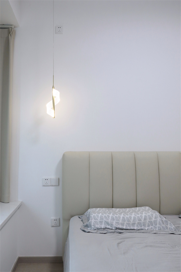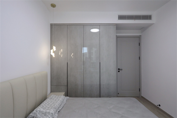 主臥延續整體黑白灰的中心色調,亞克力亮面材質柜門搭配暖光吊燈,使空間十分通透。