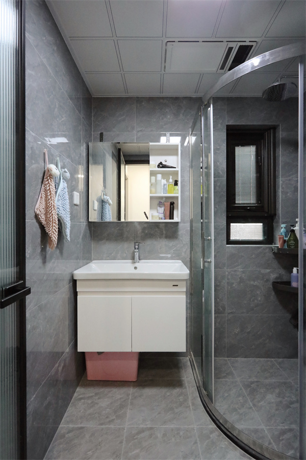 轉角圓弧形淋浴房使衛生間干濕分離,自帶小窗加強空間通風,整體空間色調統一。