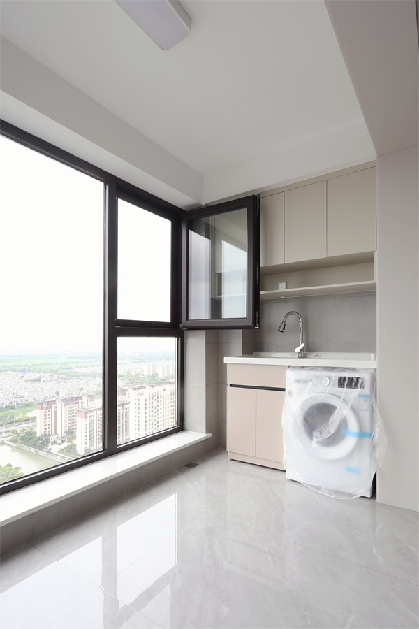 定制柜、整體臺盆、嵌入洗衣機,與一側落地窗相對,日常瑣碎也是理想生活。