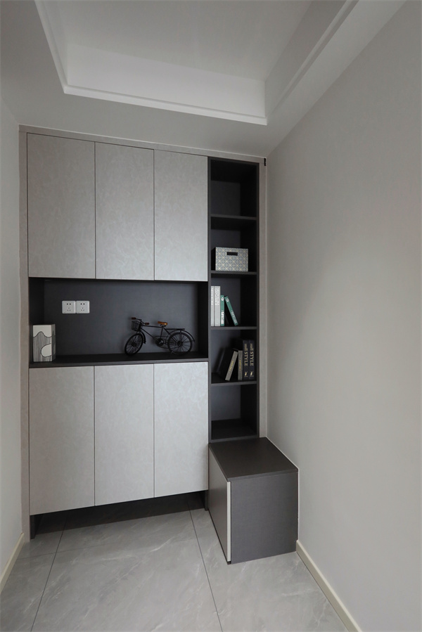 玄關為獨立區域,為入戶提供緩沖空間,一側設置整面墻的玄關柜。