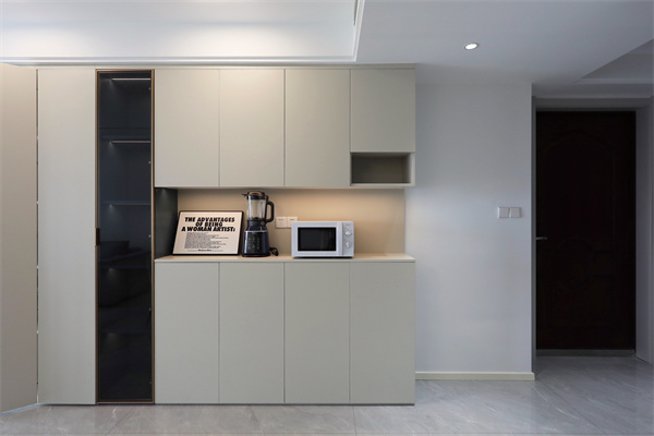 餐邊柜內埋線性燈制造空間氛圍,中部留空放上小電器,亦可成為水吧臺。