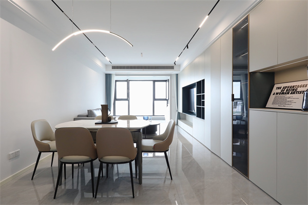客餐廳于一體,電視柜與餐邊柜相連,整體區域無主燈,餐廳設置局部燈光。