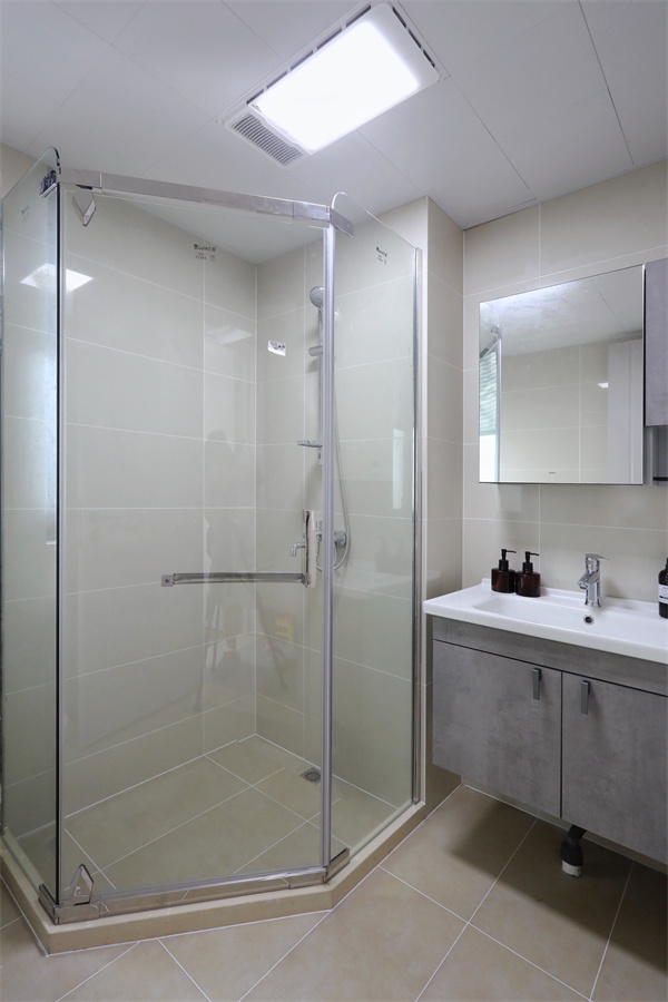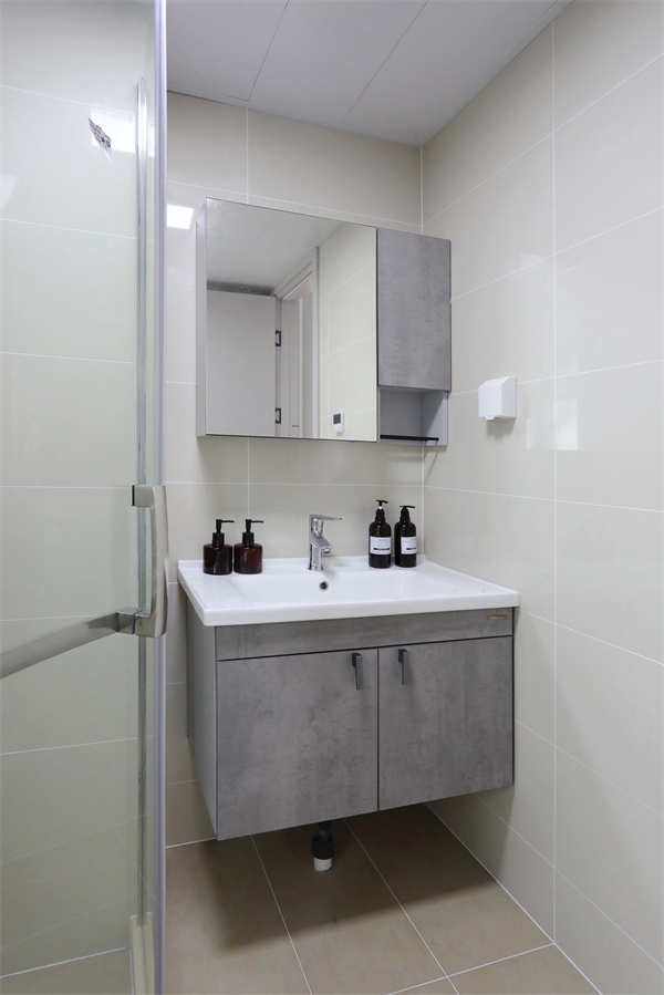 外衛的水槽鏡柜與內衛同款,墻地磚采用的暖色磚,營造舒適環境。